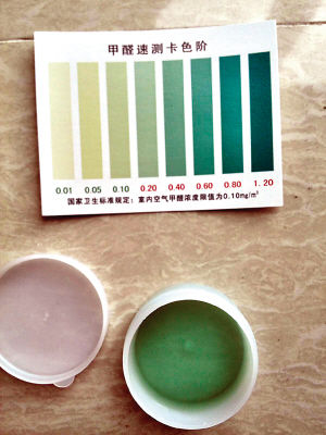 為了驗(yàn)證效果是否真如評論一般,記者決定親自試驗(yàn)一番。在天貓“山山旗艦店”購買了一箱熱銷的1kg家居專用活性炭,下單后第二天中午就送到了,不得不稱贊一下物流效率。確認(rèn)收貨后發(fā)現(xiàn)不僅買一箱送一箱,賣家還送了一個甲醛測試盒,同時客服還打來電話確認(rèn)是否收到,并且發(fā)了一份使用說明,服務(wù)非常貼心。帶著購買的一箱山山活性炭,記者來到了自己已裝修完畢還未入住的新房先測試了一下甲醛濃度,試劑顏色顯示接近0.1,是國家規(guī)定的4倍,明顯甲醛超標(biāo)。